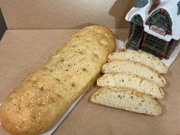 Light, airy, and distinctively dusted with sesame and nigella seeds and with the additon of garlic, our Turkish Bread is the ultimate versatile bread for any meal. This loaf is famous for its soft, chewy texture and large air pockets, making it the perfect vessel for soaking up oils, dips, or sauces.